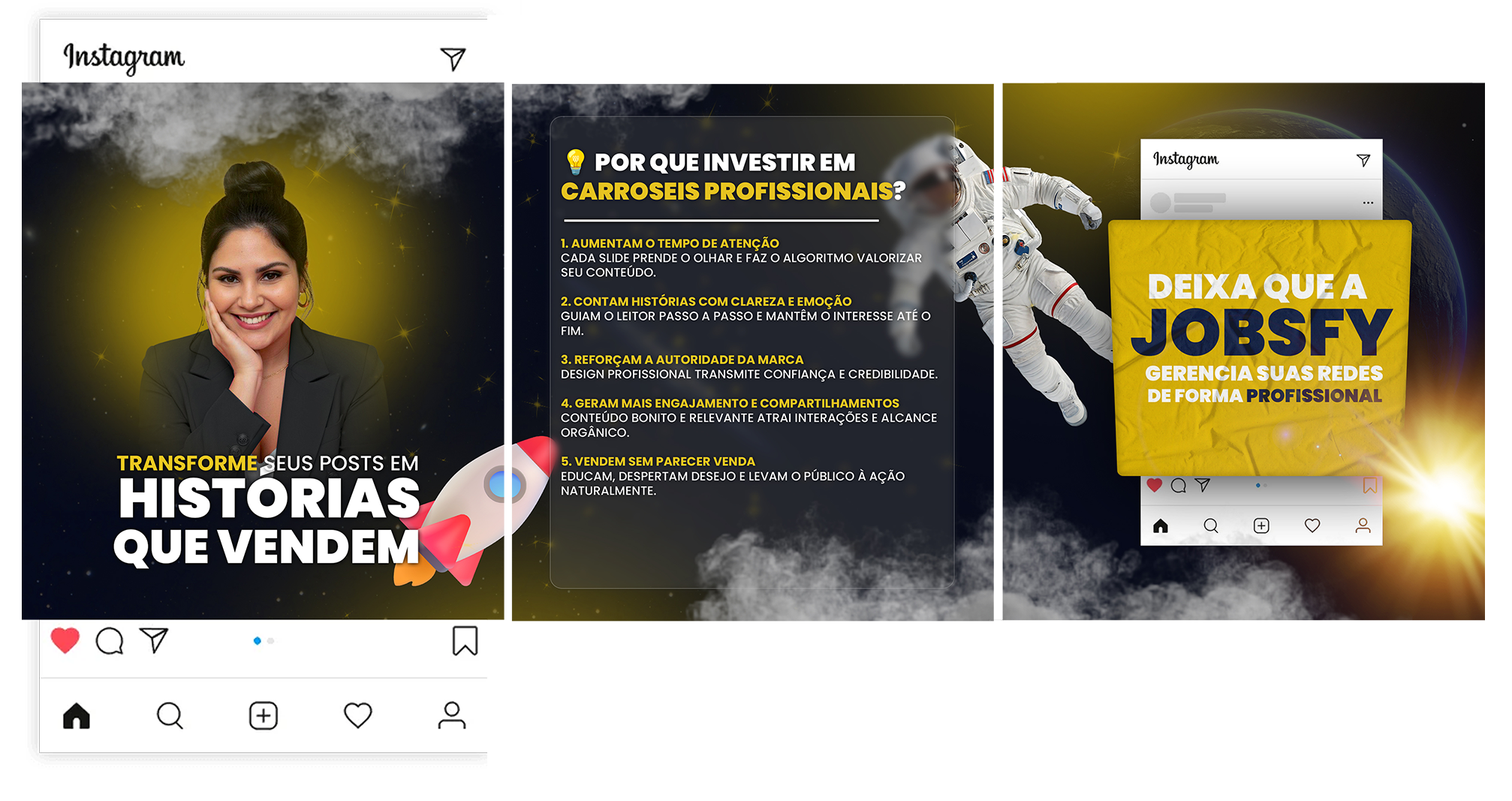 Na Jobsfy, criamos carrosséis que não passam despercebidos. Com design estratégico, narrativa visual envolvente e identidade alinhada à sua marca, seus posts deixam de ser apenas informativos e passam a gerar conexão, engajamento e vendas.